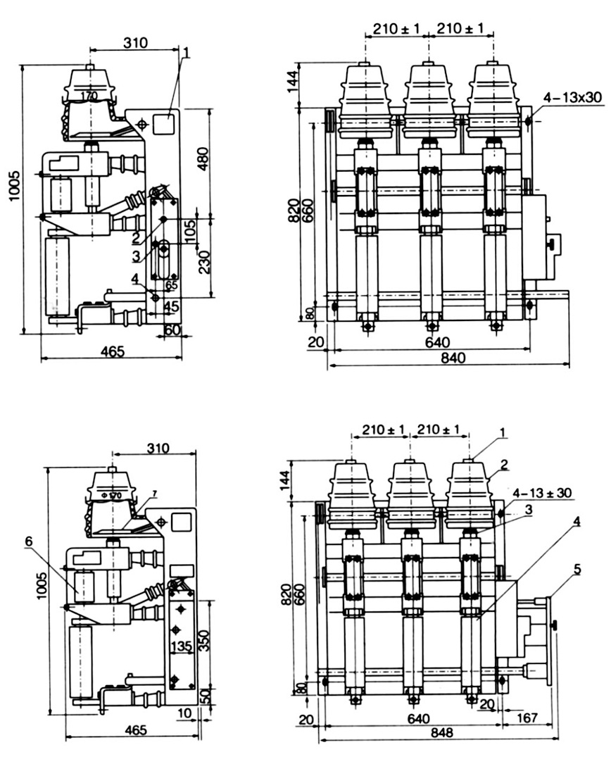 圖1負(fù)荷開(kāi)關(guān)和組合電器外形及安裝尺寸圖圖(不帶面板) 圖2負(fù)荷開(kāi)關(guān)和組合電器外形及安裝尺寸圖圖(帶面板)